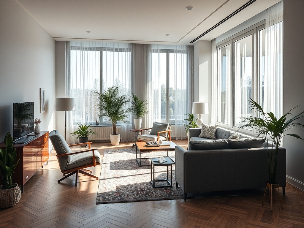 Человек с поднятыми руками стоит в уютной комнате с ярким освещением и стильной мебелью.