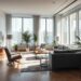 Современная терраса с уютной мебелью и зелеными растениями, красивый вид на город и ясное небо.